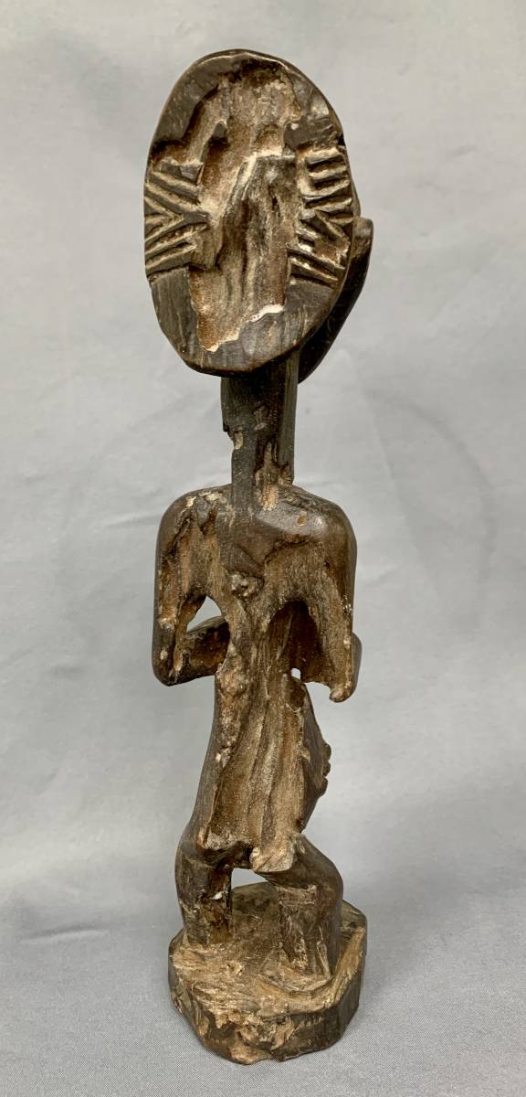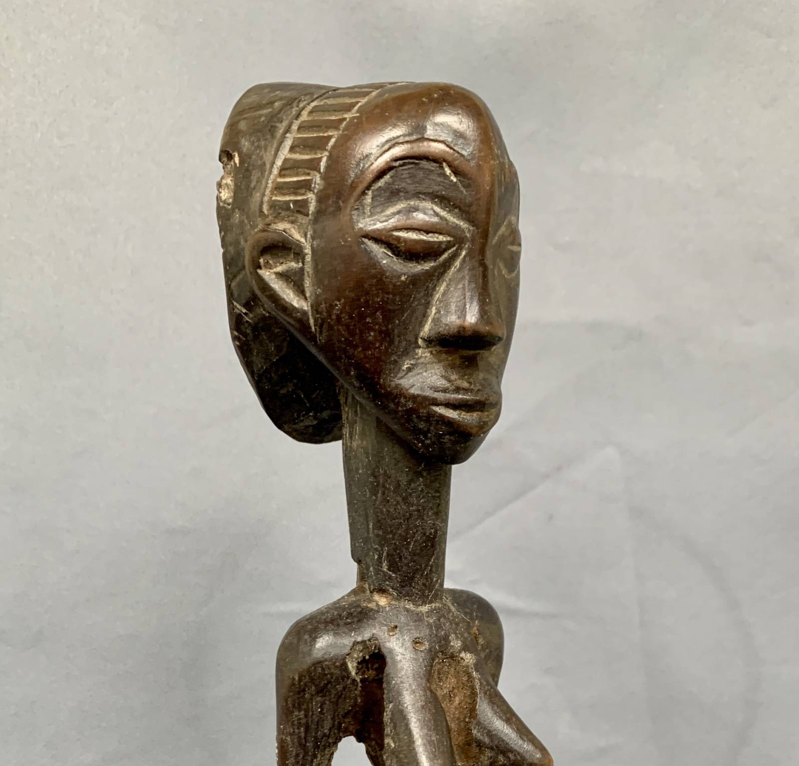 AFRIQUE - JOLIE STATUE LUBA (RDC) EN BOIS PATINÉ - PERSONNAGE LONGILIGNE FÉMININ DEBOUT MAINS SUR LA POITRINE