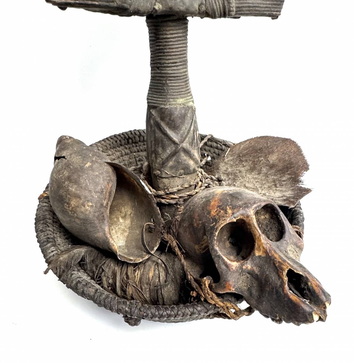 Fonction et Usage : À l'instar de leurs homologues Kota, ces effigies Mahongwe étaient des portraits symboliques fichés dans le panier contenant les reliques des ancêtres les plus vénérés du lignage. Elles étaient maintenues en place par un ruban d'écorce et servaient d'objets de culte et de protection spirituelle.