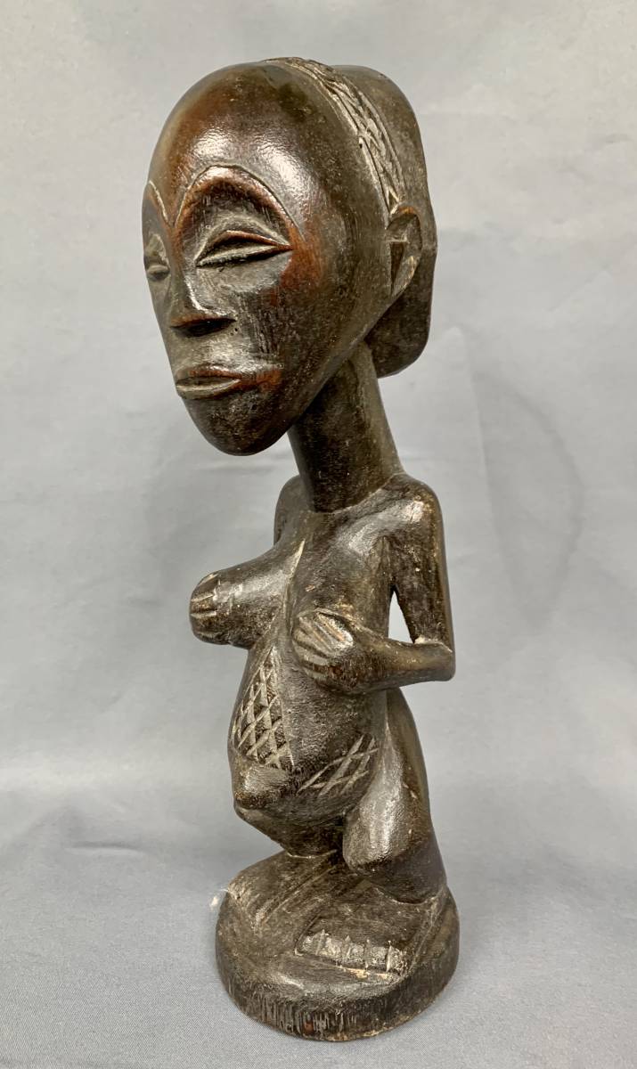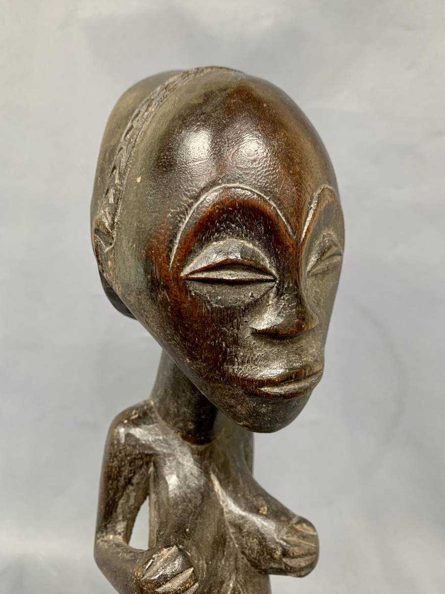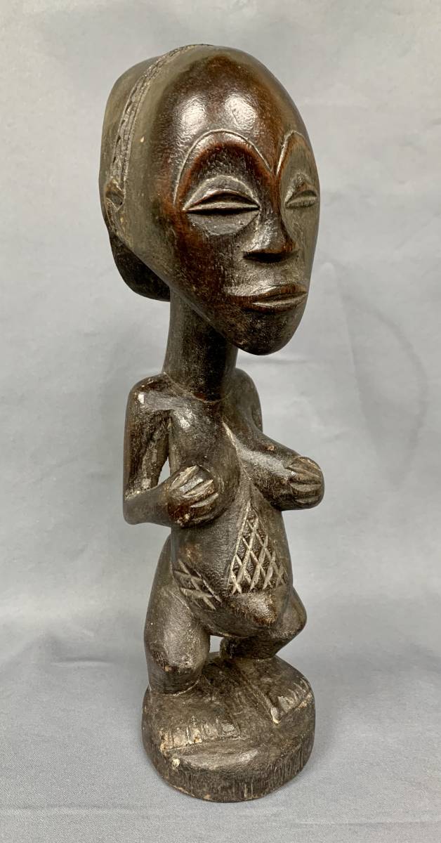 AFRIQUE - JOLIE STATUE LUBA (RDC) EN BOIS PATINÉ - PERSONNAGE FÉMININ DEBOUT MAINS SUR LA POITRINE
