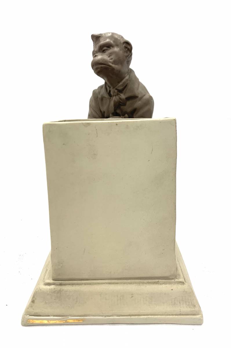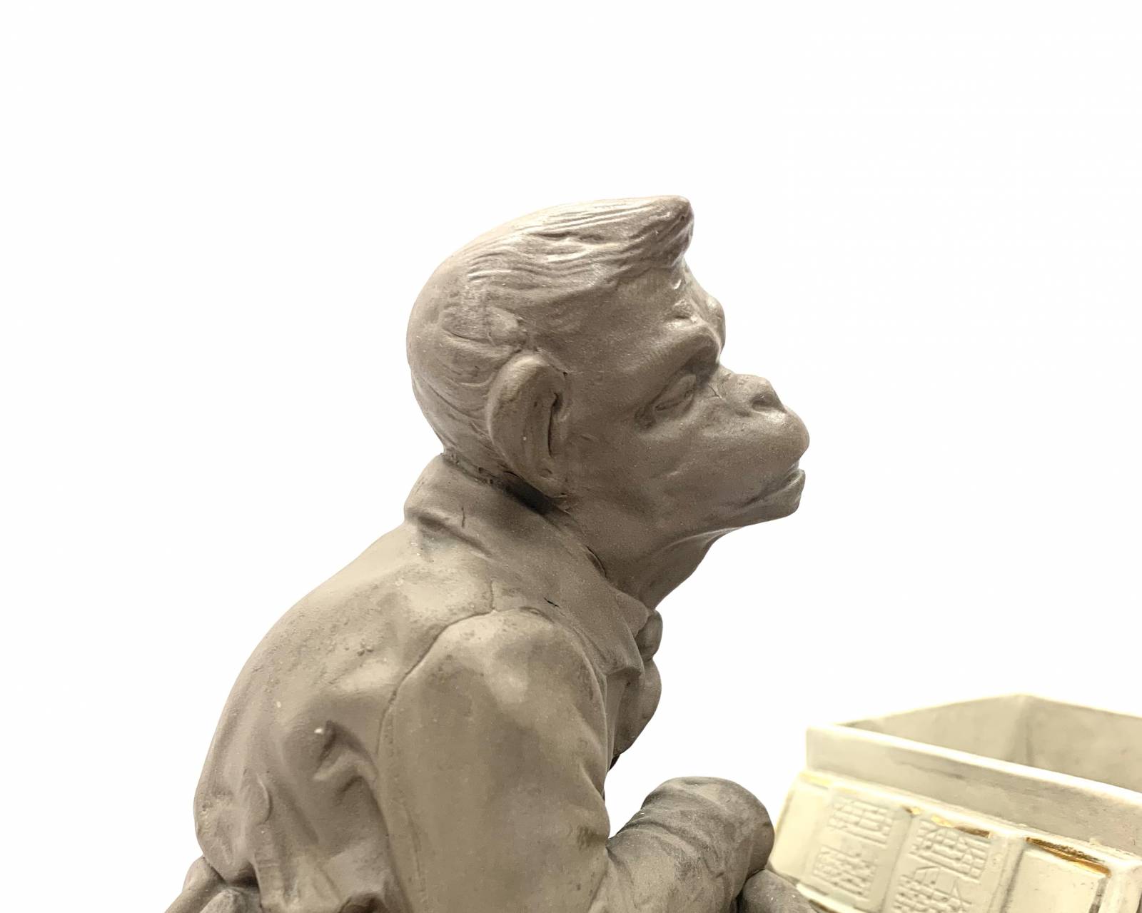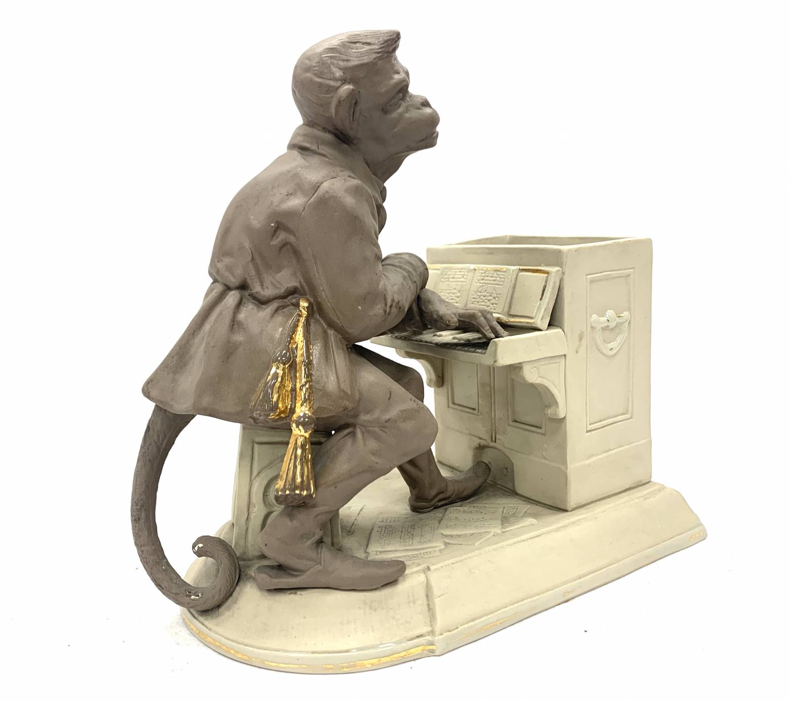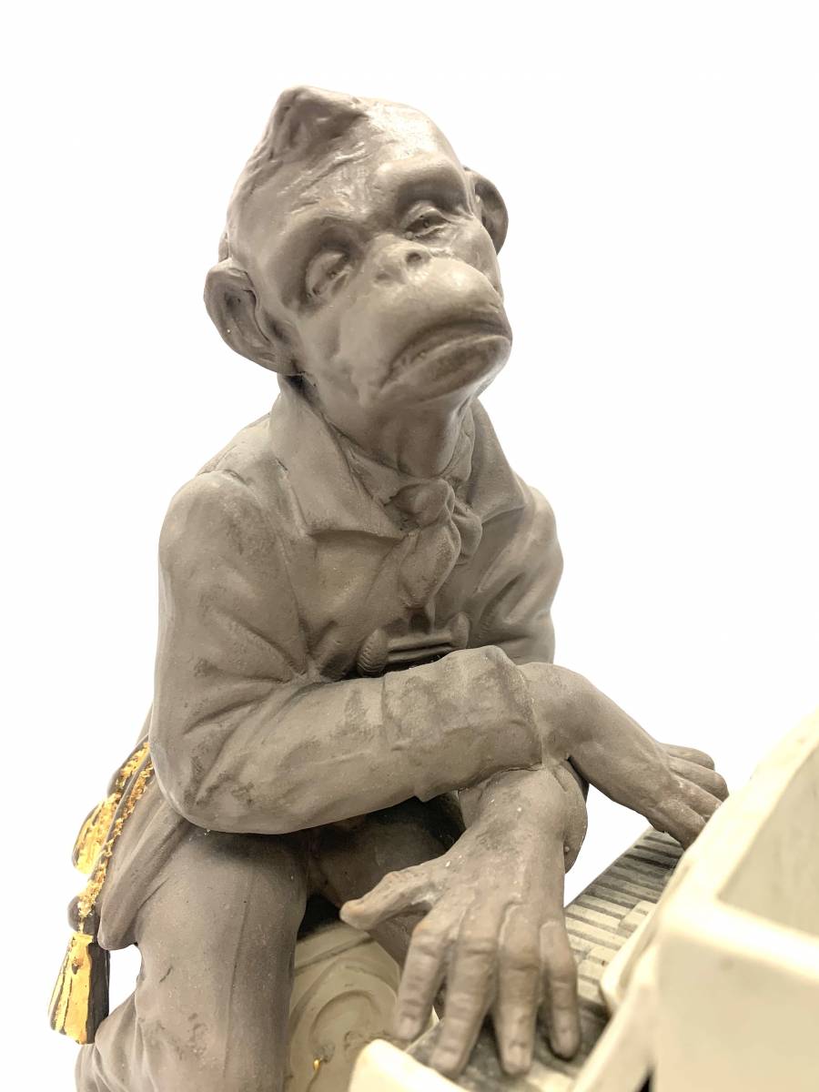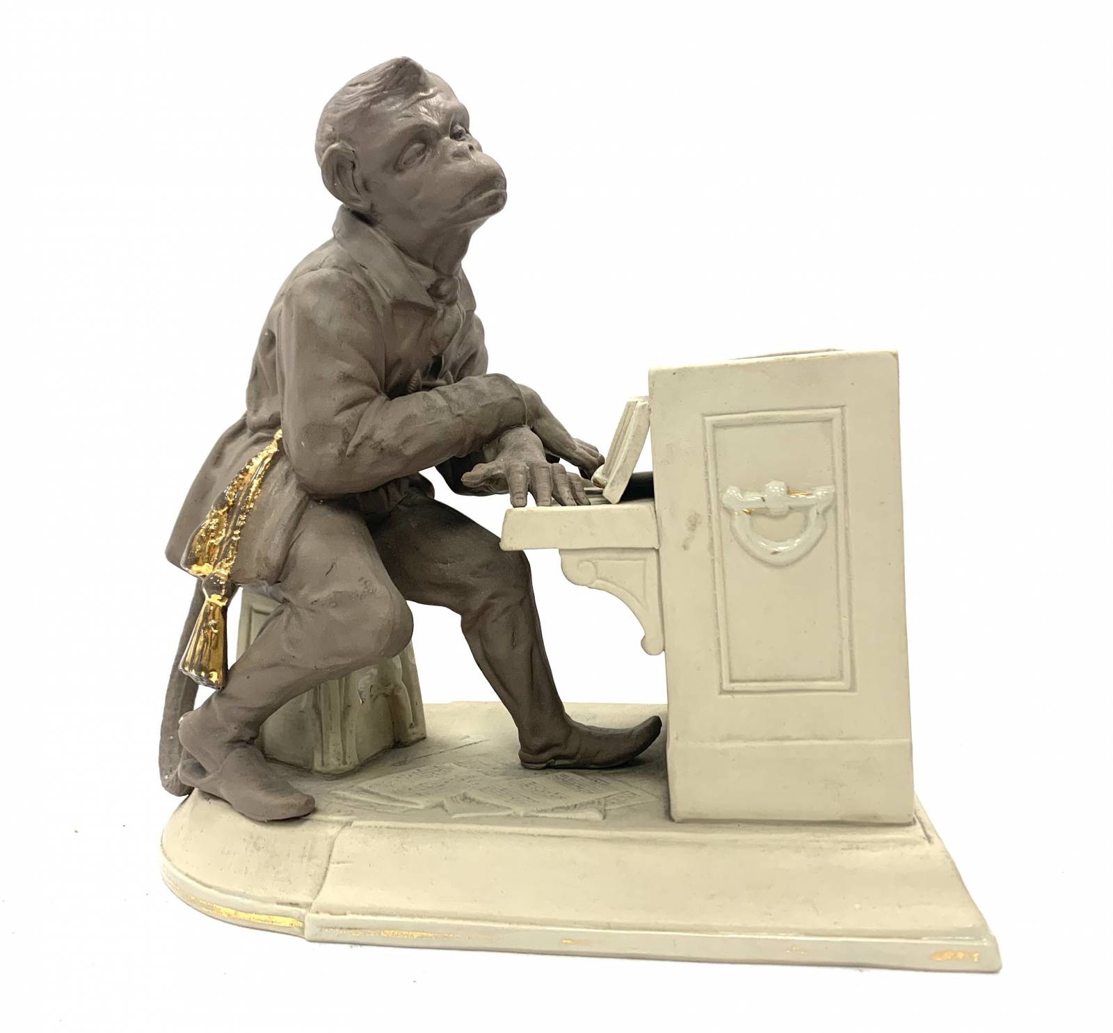 Pot à tabac ou porte-cigares en grès fin mat. Il représente un singe assis sur un tabouret jouant du piano. Le corps du piano constitue la réserve à cigares ; Modèle n° 231 ' Pot à tabac / Porte-cigares Singe mélomane '
