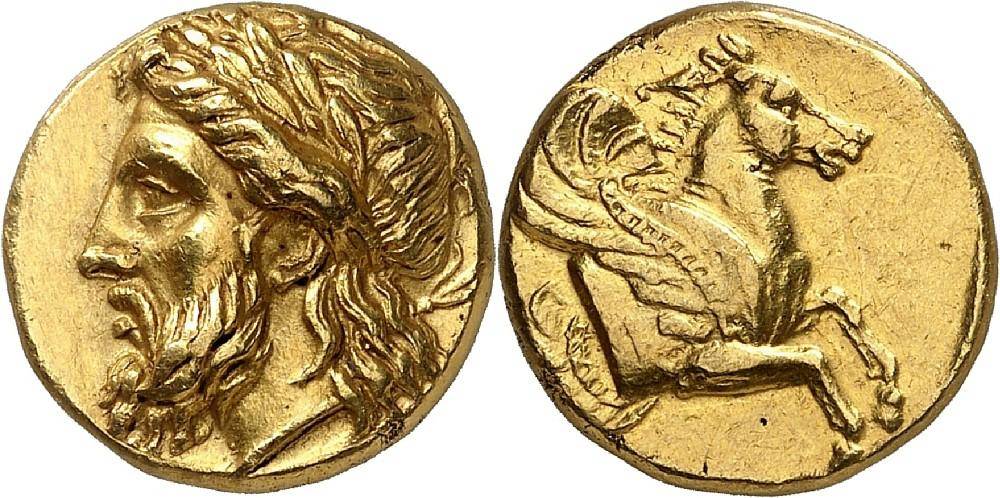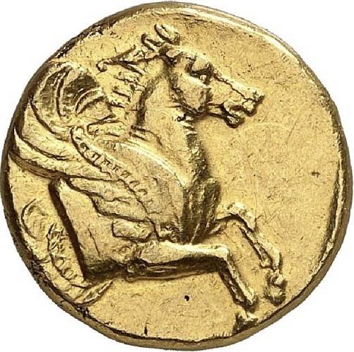 Agnes Baldwin Brett in 1924 identified some 41 distinct stater issues over a period of no more than sixty years in the fourth century BC (the metal needed for these emissions probably came from the northern Black Sea lands), which shows there was strong economic activity in Lampsakos, until the arrival of Alexander the Great, thanks to its strategic position as a harbor on the eastern entrance to the Hellespont: its prosperity can be deduced from the heavy phoros (tribute) of twelve talents which it had to pay in the mid-fifth century BC as a member of the Delian League. The city had been under Persian control from 498/497 BC, when a son-in-low of Darios I had conquered the city after a revolt of Ionian cities, until the 450s BC when it had joined the Delian League after the death of its ruler the exiled Athenian general Themistokles (who had been given the gover- norship of the Magnesian district by Artaxerxes). The fact that these gold issues were struck on the Persian weight-standard is certainly significant, all-the-more that it was the Persian navy that had defeated the Spartan fleet at Knidos in 394 BC, therefore becoming the protector of the Aegean Greeks. Typically for Asia Minor, he reverses of the gold coins struck in Lampsakos during the Archaic and Classical periods always display the protome of a winged horse, perhaps Pegasus, which saved them from the need of a legend to identify the emitter.